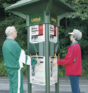 A series of seven outdoor wellness stations designed by LifeTrail for active older adults turn a daily promenade into an opportunity to engage in a number physical endeavors to maintain and enhance endurance, flexibility, strength and balance. The stations were developed in collaboration with gerontology, kinesiology and recreation experts from Penn State University.