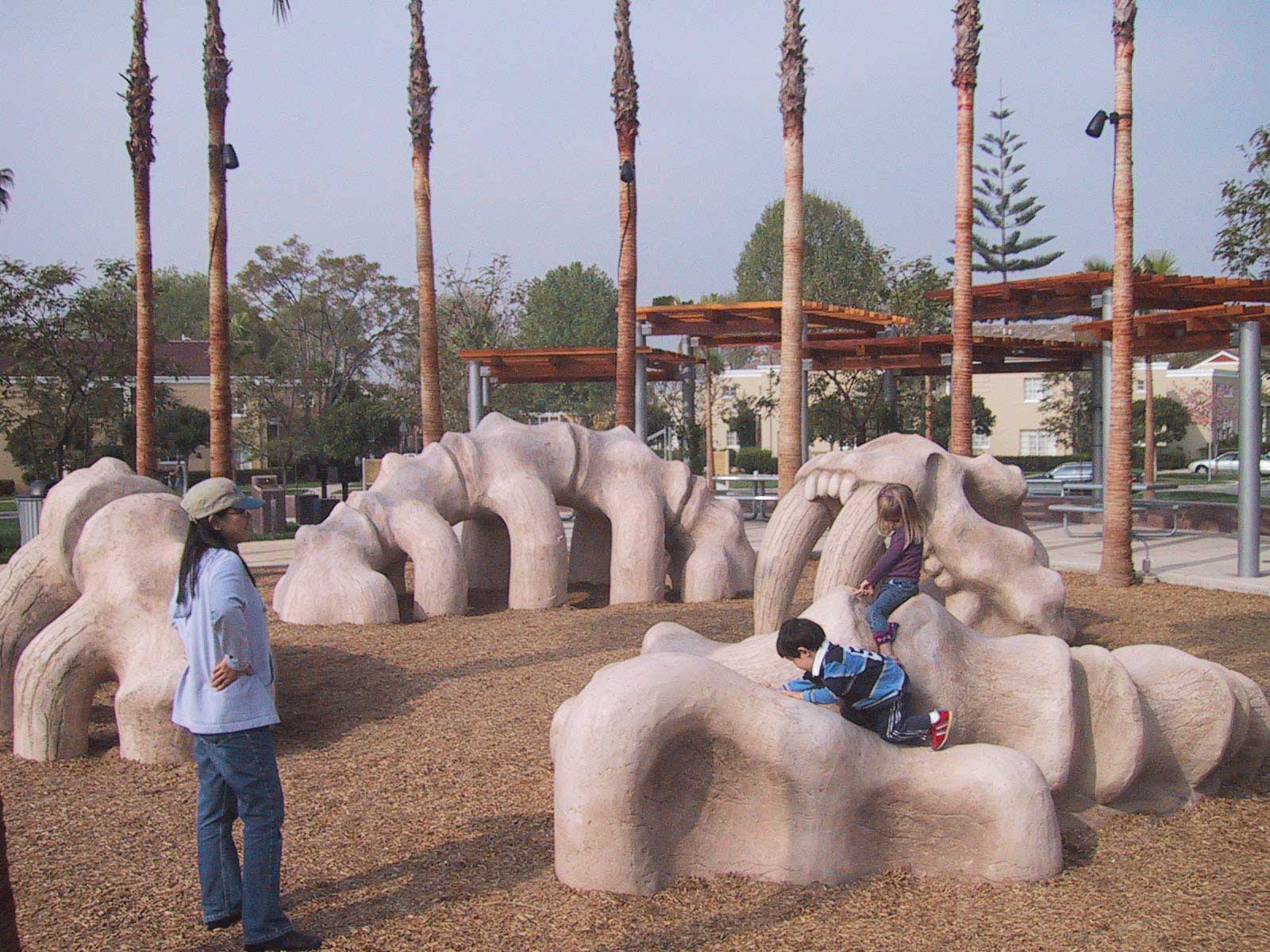 Then he visited the nearby Page Museum and saw the world famous La Brea tarpits. ?EUR??,,??I saw the saber tooth cat skeleton and I fell in love,?EUR??,,?? Oleg said. ?EUR??,,??I wanted to create sculptures which imitated an actual fossil laid out in pieces.?EUR??,,?? His final design consisted of the skull, two sections of spine with ribs, the hipbone, and the tail arranged in anatomical order so it would look like unearthed fossils. ?EUR??,,??I had seen so many animal sculptures, smooth like candy from your mouth, boring,?EUR??,,?? Oleg explained. With his final design, children can wander between the fossil?EUR??,,??s fangs, climb into the eye sockets and between the ribs.