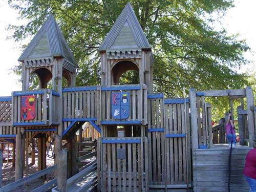The designers at CPSI Mid-South Recreation, Inc. considered the history of the playground and worked creatively to incorporate the old feel of Kids Kingdom with the new design. Today the playground stands with the original classic castle theme but with a modern twist and updated playground technology. Built from engineered wood fiber, each structure resembles a medieval tower, but with new fun features like vibrant colors and spiral staircases. As the design was carefully considered it was decided that one piece of the original playground should remain, the arched entryway which is now the gateway from past to present at Kids Kingdom.