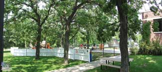 The playground resides within a grove of oak trees, providing shade for nearly the entire playground. The trees, the ?EUR??,,????'?????<?backbone?EUR??,,????'?????<? of the playground?EUR??,,????'?????<???EUR?s design, were protected throughout the development. The design and use of materials within the playground also help to ensure continued protection of the trees.