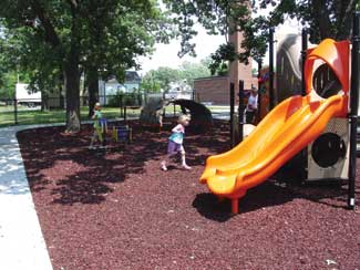 Recycled rubber mulch, synthetic grass, and sand allow for infiltration and reduce compaction during playground use. The concrete ?EUR??,,????'?????<?Tricycle Track?EUR??,,????'?????<? that bounds the playground and educates children about signs in the urban landscape, was poured without compaction of the subgrade using a high fiberglass content concrete, which continues the low-compaction root-zone theme. The mural wall, which is maintained by the local Art Club, is constructed from lightweight and durable Alucobond panels. Yes, that is the same material used in exterior building cladding systems and signage.