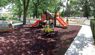 During construction, low-impact equipment was used by West Branch Construction to minimize soil compaction and heavier materials were kept out of the critical root zones of the trees. Tubular frost footings were used for play equipment, along with mural wall construction instead of continuous footing bond beams, which would have required large amounts of root pruning.