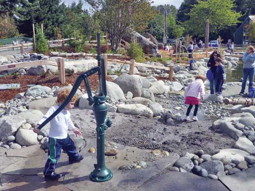 The highlight of the pond for the children is something that generations of children in rural areas have been accustomed to: a hand-operated water pump. While this water pump is drawing water from a city water line and not from a well, for Tacoma area kids today used to such modern technological marvels as instant messaging and other needs immediately fulfilled (e.g., fast food), the old technology of pumping water out of the ground seems pretty cool. The pumped water flows through lined sand and gravel beds, where of course the kids can get their hands wet and even dirty!
