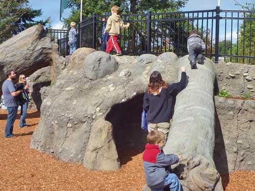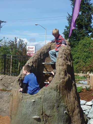 Rain Gardens Adjacent to the Pond Supplement Pond Overflow and Site Drainage. The majority of the exploration features were custom-designed by J.A. Brennan and manufactured on-site by shotcrete artisans from Turnstone Construction, Inc. The elements consist of flexible rebar cages that support the shotcrete applications. Paint, textures, and detailed applications such as mushrooms and lichens give an authentic appearance of the forests of the Pacific Northwest. Shotcrete creations include a climbable snag, a downed hollow log that can be crawled through, a log slide and mud bank cave.