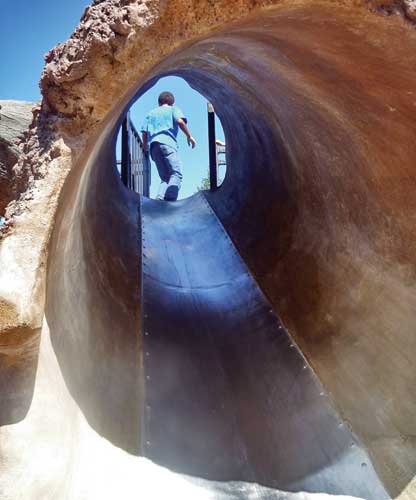 Custom designed shotcrete creations include a climbable snag (a ?EUR??,,????'?????<?tree?EUR??,,????'?????<? embedded in a stream bed, a downed hollow log to crawl through, a log slide and mud bank cave.