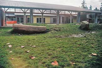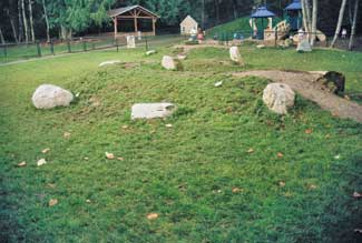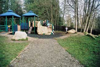 Eventually a hill some 20-feet high with a base in excess of 80 feet was built to hold double slides with a run of over 18 feet. Additional excavated dirt was dumped randomly in an area designed as a berm and boulder play area. Boulders that were exposed during excavation were kept in a pile on-site and later placed in the berm area and used as accents to designate the entrances to play areas. The same ?EUR??,,????'??save and use?EUR??,,????'?? principle was done with the stumps and logs on the site. A large stump was used as an accent in the middle of the designated tricycle path area and large logs were used as containment for the steep side of berms to create higher elevations.