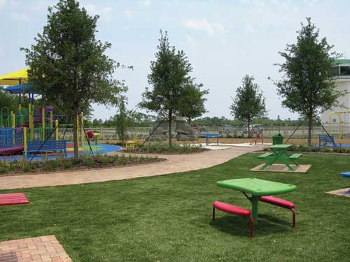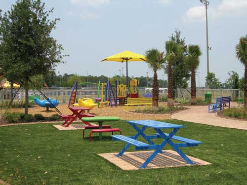 A raised curb edging was used along the walkways to provide separation between the playground, specialty mulch and pine bark within the planting areas. To create a park-like atmosphere within the playground, large cathedral oak shade trees were added in planting areas along the left side of the walkway. Trees were also planted behind seating benches and in the picnic area. The plant palette included orange bulbine, hamelin fountain grass, dwarf yaupon holly, weeping yaupon holly, lavender crape myrtles, cathedral oaks and red flowering upright bottlebrush trees. The plants are easy to maintain, soft to the touch and provide seasonal color throughout the year.