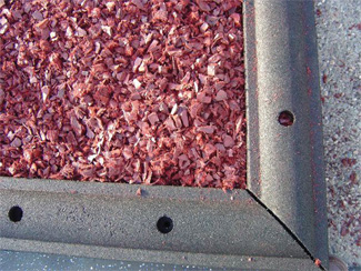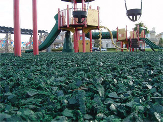 Tierra Verde Industries has two practical uses for the rubber: Grubble, a playground surface made of 100% California recycled tire rubber (no steel belted tires used) ground into gravel-size particles and offered in four colors (brown, grass green, wine red or sky blue) that will not leach into soil; and Flex-O-Curb, rubber curbing specifically designed to contain loose-fill ground cover, which alone puts over eight million pounds of recycled rubber from landfills to use.