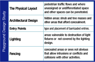 Security might be considered in several ways: ones personal security from the antisocial behavior of others, and the security of property. It is imperative that playground designers and operators eliminate the potential for victimization and the fear of victimization. This implies providing adequate entry/exits in the playground, surveillance, patrols and other measures.