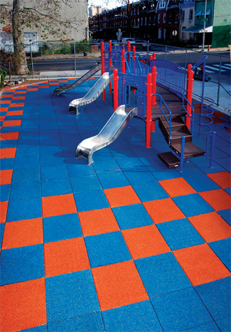 Most rubberized surfaces are made from recycled rubber, EPDM (ethylene propylene diene monomer) and binding agents. The interlocking tiles from SofSURFACES in these photos, according to the company, have a unique three-step compression molding that produces a tile with a higher degree of density for longevity. The tiles come in thicknesses of 1.75, 2, 2.5, 3, 3.25, 4 and 4.5 inches depending of the fall requirement (3, 4, 5, 6, 7, 8 and 10 feet).