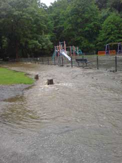 The first safety concern was, of course, was putting fencing or barriers up to keep children away from flooded playgrounds. When the waters began to recede, the National Program for Playground Safety (NPPS) suggested signage to warn of contaminated surfacing and equipment from stormwater runoff. The presence of e-coli and other bacteria, viruses and toxic chemicals are all concerns.