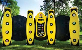 NEOS brings electronic gaming to outdoor play space with four towers of interactive sound and buttons that light up in random sequence depending on game selection. NEOS sports nine different games and three skill levels. Players compete for points, which are electronically recorded during play.