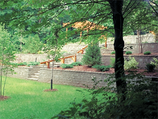 Some retaining wall manufacturers have opted to create lights that can be built into the wall in the same way as the rest of the structural units. Risi Stone Systems produces RisiLights??????oe – self-contained, fiberglass and acrylic units that have been textured and color-matched to resemble their adjacent Pisa2??????oe or PisaStone??????oe blocks when installed. With the lights switched off during daytime hours, it is difficult to tell the difference between the lighting units and the concrete wall blocks. This seamless color and texture matching affords the walls the capability to truly blend in unobtrusively with their surroundings. RisiLights??????oe are shipped complete with instructions and wiring; the only additional items needed are the light bulb and the appropriate underground electrical cable. For an illustration of how these lights look in both day- and night-time conditions, refer to the accompanying photos of the terraced landscape.