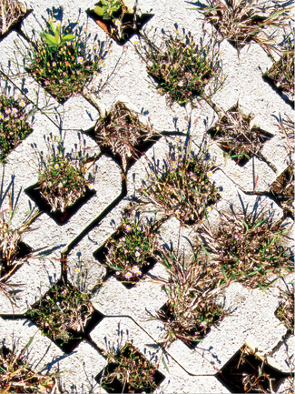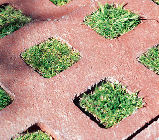 Green parking is a term describing a parking lot, often for overflow and emergency routes, wherein turf or grass paving stones are utilized. With an open void in the large paving stone, natural or planned vegetation can grow. Aggregates can be used as an alternative to filling the voids when vegetation is not required for ecological, environmental or aesthetic needs. The concrete grass paving stones are manufactured with an average compressive strength of 4000psi and a water absorption maximum of seven percent. Typically, a paved area designated as green space is subject to wheeled or vehicular traffic and may become so compacted that the permeability of the soil structure is inhibited to the point that the grass is unable to survive. Green paving structures reduce the impervious pavement while improving stormwater runoff concerns.