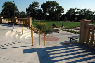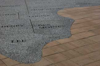 The first task was to remove an existing parking lot that has served as the Capitol?EUR??,,????'???s front lawn experience for years. In its place, the design team created a pedestrian-oriented space that provides a connection between the Capitol grounds and downtown. Pedestrian accessibility is achieved by four sets of ramps and steps that are arranged to provide similar experiences for people of all abilities as they negotiate the grade. The ramps divide the space into five distinct areas, creating a sense of progression, a separation between uses, and different experiences as one moves through the mall. On the west, a large plaza with entrance monuments introduces the visitor to the Capitol complex. On the ground plane a map of Iowa oriented to true north terminates the East Locust streetscape and completes its theme. The East Locust streetscape lists all the county seats as one walks east towards the Capitol, then, as one enters the terrace, all the county seats are shown in relation to one another on the Iowa map. As one moves east through the first set of ramps, they enter a transitional space scaled down to a more human scale; this space has planting beds and seating for those who wish to pause and enjoy the space. At the top of the second set of ramps, one enters the central plaza space; banks of flags flank the space to the north and south, and a large in-grade fountain punctuates the whole West Capitol Terrace from the City of Des Moines with a burst of color and water. When the fountain is turned off, the plaza acts as a gathering space for small to medium sized public events. Passing through the third set of ramps, the visitor will come to another transitional space mirroring the first. And finally, at the east end of the mall, the visitor emerges onto a large public plaza. This plaza can act as a stage to crowds gathered on the west terrace for special events such as the annual Fourth of July Concert. The whole length of the mall is flanked by a double row of overstory trees that frame the views from the east to downtown Des Moines, and from the west, toward the Capitol Building.