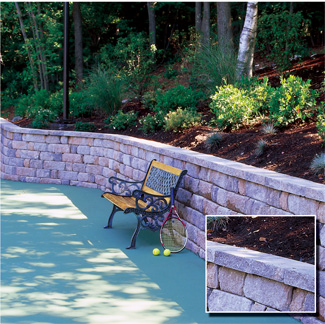 The new court was designed to be an architectural centerpiece to the property while providing a beautiful outdoor recreational area for the family. A path from the main house cascades down the sloping terrain into the tree-encased court. Surrounded by beds on both sides, the path stones have been laid on level sections of the walkway creating a natural traffic flow to the court. The landings along the path provide balcony-like viewing. The surrounding walls capped with Anchor Highland cap were moved at least three feet beyond the standard court design and provide more than 120 linear feet of comfortable sitting areas.