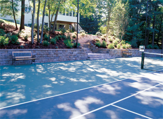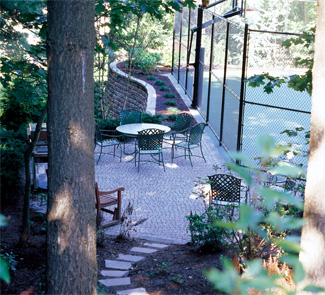 “Along the southeastern side of the court, a 25×15 foot irregular shaped patio was placed abutting the court and fencing. This patio, which includes the barbecue area, tables and chairs, provides excellent viewing of the court?EUR??,,????'???s playing area,” Medeiros said. “Granette Setts, a seven-stone paver system, also in the fieldstone color, were selected for their ability to deliver a natural path-like look as well as to integrate the patio setting into the overall design.”