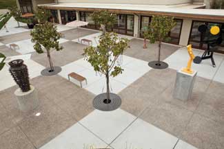 While traveling along the Monarch Club’s entry drive, visitors may catch a glimpse of the sculpture court. The sculpture court and plaza is organized by a checkered pattern of natural gray and exposed aggregate concrete squares. Each square provides a temporary home for a rotating sculpture exhibit. The client, Shea Homes, partnered with the San Luis Obispo Art Center to showcase local artists on a seasonal basis. Paving patterns and sculpture locations also align with the architectural articulations and custom tile work found in the building’s interior.