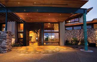 Visitors to the Monarch Club are swept towards the main entry along a dramatically curving drive and are greeted by custom-designed sculptural totems and a grand monarch butterfly, set in seeded-glass concrete. The colors and patterns of butterfly wings continue throughout the project site in both sculptural and utilitarian forms. From sculptural totems to decorative columns, guests are directed to the main entry along a common theme. In route to the front doors, guest traverse across a 30-foot wide, single butterfly wing set in colored, glass-seeded concrete. The patented Lithocrete paving system provided a colorful and effective solution to achieve the custom design pattern. Once inside the building, guests can discover the butterfly wing mirrored, in custom-patterned, interior finishes.
