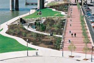 Although concrete was less expensive, Carmichael says EDAW had no trouble convincing the Sports and Exhibition Authority to invest in clay pavers for the esplanade. ?EUR??,,????'??They wanted it to be first class, and they wanted a 100-year life span for the project,?EUR??,,????'?? says Carmichael. ?EUR??,,????'??We used the brick to set off the esplanade from the rest of the park, and it was intentionally built wide so that it could be a gathering place, an area that the city will use for festivals and celebrations.?EUR??,,????'??