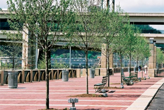 To create a distinctive, classy look, EDAW specified Iron Spot and Buff colored interlocking clay pavers made by Pine Hall Brick in Winston-Salem, NC. ?EUR??,,????'??We chose brick because we wanted to create a feeling that this was a special place,?EUR??,,????'?? says Dennis Carmichael, vice president of EDAW and principal designer of the project.