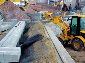 Another benefit of larger SRW systems is that they may minimize excavation costs. Because of their larger unit dimensions and weight, they can in many cases be constructed as conventional gravity walls (not requiring geogrid reinforcement). Because the wall units are better able to rely on their own gravity for stability, the need to lay geogrid is often eliminated, thereby reducing the amount of excavation to be done on-site. This decreased area of excavation will permit the wall to be built closer to existing obstructions (structures, trees, etc.), as well as solving difficult property line issues (as geogrid reinforcement cannot extend over property lines).
