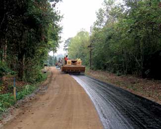 That advice was taken. The gravel was blending with cement and subgrade materials to a depth of six inches. Over this cement-stabilized base was spread a thin asphalt surface (chip seal).