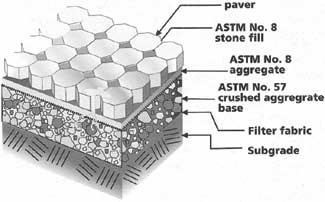 The hardscape top layer is porous concrete bricks. Water flows through the 5-by-9-inch bricks and then passes through several layers of filtration, including aggregate bedding and permeable geotextile fiber. The water then passes through perforated pipes and seeps into the subsoil and to the aquifer.