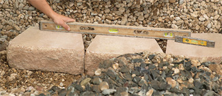 The blocks should be leveled front to back and side to side. If the wall site is on an incline, the blocks should not be slopped, but stepped, so they remain consistently level. Check for proper alignment before moving on to the next step. We recommend using the 18-inch unit for the base course. That?EUR??,,????'???s why there are more 18-inch stones on the materials list.
