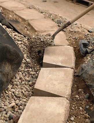 Shovel the in-fill soil behind the drainage aggregate and compact the in-fill with a hand-operated compactor. Make sure the aggregate is level with or slightly below the top of the base course. Place soil in front of base course so that it is buried.