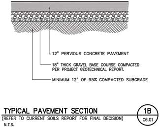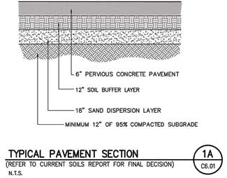 There used to be oil fields on the site, so methane gas mitigation was required. The mitigation measures helped with the permeability because of the sand layer. The theory behind the system is that if there?EUR??,,????'???s a crack in the earth and a concentrated area of gas was coming up, it would hit the sand and then after percolation go on up at safe non-flammable levels. Three feet of the soil had to be excavated and then filled back in with compacted sand. Then another 18 inches of soil was added on top of that. Another advantage of the permeable concrete, which looks like rice krispies and is colored ?EUR??,,????'??kahlua,?EUR??,,????'?? is that one isn?EUR??,,????'???t able to see the patch work that well in case of cracking.