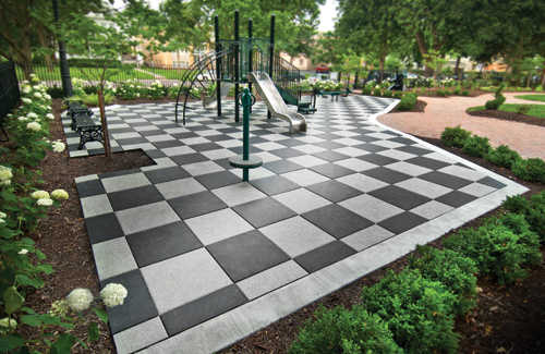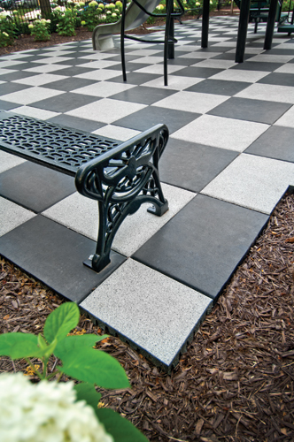 Manufactured in the U.S.A. by ECORE International, these safety surfacing tiles are designed to reduce the risk of serious injury associated with falls from playground equipment. This particular tile can be specified with custom colors and even logos that make it amenable to a variety of projects.