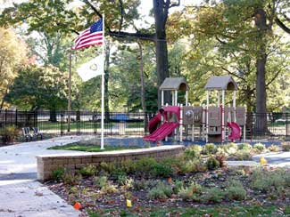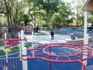 A winding, colored asphalt path loops through the playground, emulating the Passaic River. A large, circular paved area with seat walls in the center of the playground references the industrial millwheels that harnessed the river?EUR??,,????'???s power and drove the great mills that made Paterson the birthplace of the American industrial revolution. A playful water park with spray jets that shoot water out of the ground recalls Paterson?EUR??,,????'???s Great Falls. Two state-of-the-art play structures with rubberized safety surfaces, benches, game tables and swings are set within the fenced playground among mature oak trees.