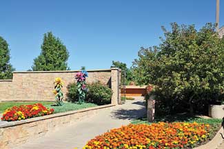 Just outside these gates are three large metal flower sculptures. These colorful sculptures as well as a large metal butterfly that hovers over a massive flower display, add a playful element to the environment, and compliment the natural plantings.