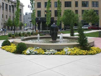 In addition to the change in tree species, the design called for the installation of as much lawn space as possible to further minimize the tree canopy. An existing stage had to be incorporated into the new design and the fountain remains, though it was reconfigured. In addition, a mural painted onto the wall of a neighboring building is more visible now as a result of opening up the park.