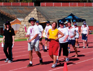 The relay is an all-night event in which teams of 10 must have one member walking on a determined path at all times. Along the nighttime course are luminaries with the name of a cancer survivor on each one. Teams raise money by selling these luminaries to friends and families of cancer victims and survivors.