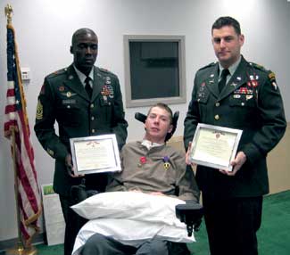 Sgt. Woods was near the end of his second tour of duty in Iraq and due to return to Fort Campbell, Ky. in November 2006 when he was shot by a sniper on August 26, 2006. The bullet entered the back of his neck on the right side and made a diagonal cut through and came out of the left jawbone. He had emergency surgery in Iraq to reconstruct his left jawbone, and to repair his esophagus and pharynx. At Walter Reed Army Medical Center he had spine-stabilizing surgery. Although the bullet did not sever his spinal cord, it caused traumatic injury to his spine and he is currently paralyzed from the neck down.