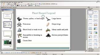 Fig. 1, left: The Impress interface is very similar to PowerPoint, can open and save to the PowerPoint and it?EUR??,,????'?????<????????????EUR??,,??s free. Google Presentations If you are willing to go a little further, Google Presentations (docs.google.com) may appeal to you. This web-based product facilitates creation of PowerPoint style presentations, but allows interaction with other users. For example, multiple users can simultaneously edit slides together if working collaboratively, which can help avoid creating multiple versions of the same file as each author independently modifies it. Additionally, Google Presentations facilitates online presentation. The presenter provides attendees with a URL and each attendee can simultaneously view the presentation on their own web browser. One user controls the presentation, and the attendees can follow that user or flip through the slides at their own pace. An online chat session is also open in the browser window, to allow attendees to post questions and comments throughout the presentation (see Fig. 2). Google has implemented the ability to import and export PowerPoint files and also allows export to PDF or TXT formats. Again, this tool is free and the web-based nature of the product makes it accessible on all operating systems. Fig. 2: Google Presentations facilitates online presentations. The presenter provides attendees with a URL, which allows each attendee to simultaneously view the presentation on their own web browser and post questions and comments throughout the presentation. Prezi If you are looking for a fresh approach to presentations, it is worth taking a look at Prezi (www.prezi.com). Prezi is another web-based tool that has a free version, although a Private and a Pro version with additional features are available for purchase. Prezi avoids the slides, a format they claim can obscure ideas. As such, their product is a refreshing change to the traditional PowerPoint presentation. Specifically, it includes two new features that are well suited to landscape architecture presentations: an alternative ?EUR??,,????'?????<????????mindmap?EUR??,,????'?????<???????? workflow and the ability to pan and zoom. Prezi departs from the traditional linear flow used in most presentations software. Instead, it uses the mindmap concept. Each presentation is a map that consists of a set of objects. Objects are a combination of text, images, or videos. The creator defines a path through the map?EUR??,,????'?????<???????????the order in which the objects will be viewed. This can be linear, but more complex orders where certain objects are revisited are often useful. Additionally, a path may also include several different views of the same object. This allows for intuitive presentations, as the very structure of the presentation reinforces the content. For example, you can first look at a large portion of the map as an overview, then zoom in to examine details of the idea, and finally zoom out to summarize. Figure 3 shows a path definition within the Prezi editor. This presentation visits a central map, then examines specific regions, returning to the central map after each regional analysis. The blue circles in the top right are the part of the editor interface that is used to define the path. Fig. 3: This presentation in Prezi editor visits a central map, then examines specific regions, returning to the central map after each regional analysis. The blue circles in the top right are the part of the editor interface that is used to define the path. Another very useful Prezi feature is the ability to pan and zoom within the presentation. This is particularly applicable to landscape architecture presentations where it is often necessary to look at an overview map and then zoom in to examine details. Additionally, the ability to pan through the presentation is often very useful when addressing audience questions and seems to work more naturally than flipping back through a large number of slides. Figure 4 depicts the Prezi viewer playing the presentation shown above. Note the Prezi logo on the lower right?EUR??,,????'?????<???????????this will be present if you are using the free version of the viewer. Another strength of the product is its simplicity. It is evident that considerable effort went into the creation of an intuitive and easy-to-use interface. While learning the product, not once did I think, ?EUR??,,????'?????<????????Why did they do it that way??EUR??,,????'?????<???????? or ?EUR??,,????'?????<????????Wouldn?EUR??,,????'?????<????????????EUR??,,??t it be better if?EUR??,,????'?????<?????????????(R)??EUR??,,????'?????<???????? First time users can expect to create a usable presentation within 30 minutes. While Prezi presents a fresh perspective on presentation software, there are several drawbacks. Currently, a limited number of templates are available and designers will not find the versatility in selecting fonts and colors they are accustomed to in other software packages. Future versions are expected to address these shortcomings. Also, users of the free version should be aware that showing an online presentation can fail if the online connection fails. Pesentations can be downloaded and viewed with an offline viewer to avoid this, but users of the free version have a limited number of downloads.