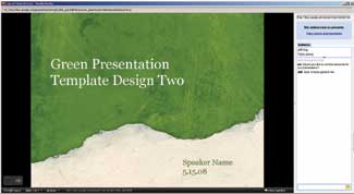 If you are willing to go a little further, Google Presentations (docs.google.com) may appeal to you. This web-based product facilitates creation of PowerPoint style presentations, but allows interaction with other users. For example, multiple users can simultaneously edit slides together if working collaboratively, which can help avoid creating multiple versions of the same file as each author independently modifies it. Additionally, Google Presentations facilitates online presentation. The presenter provides attendees with a URL and each attendee can simultaneously view the presentation on their own web browser. One user controls the presentation, and the attendees can follow that user or flip through the slides at their own pace. An online chat session is also open in the browser window, to allow attendees to post questions and comments throughout the presentation (see Fig. 2). Google has implemented the ability to import and export PowerPoint files and also allows export to PDF or TXT formats. Again, this tool is free and the web-based nature of the product makes it accessible on all operating systems.