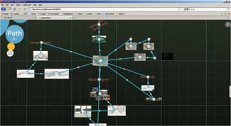 Figure 3 shows a path definition within the Prezi editor. This presentation visits a central map, then examines specific regions, returning to the central map after each regional analysis. The blue circles in the top right are the part of the editor interface that is used to define the path.