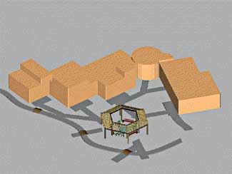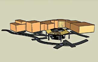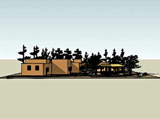 The second stage development plans began with the AutoCAD?EUR??,,????<??? 3D wire frame model imported into SketchUp?EUR??,,????<??? as a .dwg (drawing file). It is easiest to work in the ?EUR??,,????'??iso/Shaded with Textures?EUR??,,????'??? mode as vertical plane lines and arcs can be difficult to differentiate in the Top and Front views. (See Fig. 3.) Landscape and scene details were added: windows and doors to the casitas (apartments), boulders, plants, people, materials and shadows. This stage of completion is the artist?EUR??,,????'???s concept: top, front and side view at different angles and depth ranges are shown with manipulating basic toggle buttons, orbit and zoom tools. (See Figures; 4 front, side and top).