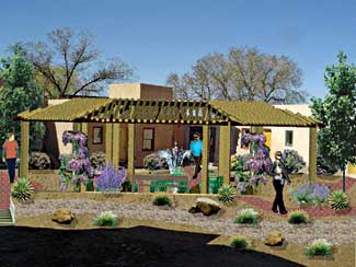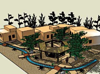 AutoCAD?EUR??,,????<??? models of the arbor, benches, fountain and courtyard plants were converted from a .dwg (drawing) block to a .jpg (pixel) file and imported into the digital photo with the new casitas (apartments), existing trees and sky in the background. While 3D CAD models of pathways, trees, people and site furnishings are able to be converted to a photo program, Design Imaging?EUR??,,????<??? has easily accessible libraries with thousands of images; even such items as picnic tables, firepits and BBQ grills are included in the database. Placement and sizing of details is fairly easy, similar to cut and paste tools. Lighting gradation, shadows and 2-3 point perspective manipulation of objects requires some practice with the program. An example of the finished product is shown in Figure 5.