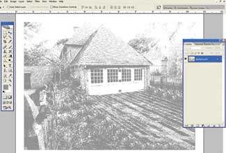 To create this simple photomontage, the original ?EUR??,,??before?EUR??,,?? picture was open and set as a base (Background Layer) on the layer management floating window of Adobe Photoshop CS2. Make sure the paper size and resolution are adequate for final printing and the color mode is set to RGB. Several layers have been created for further manipulation of specific photographic elements such as the garage door; pavers, walls, and shrubs, as illustrated in Figure 4.