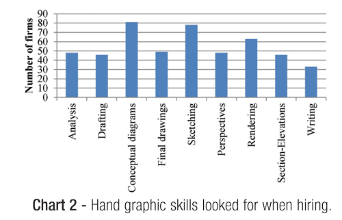 What type of hand graphic skills does your firm look for when hiring? (see chart 2.) So it seems that although these skills are not often used in the office, they are valued as signals to someone?EUR??,,????'?????<????????????EUR??,,??s ability to think in those terms, primarily through conceptual diagrams and sketching but also artistically through rendering. I believe such thinking and personal artistic expression will keep LAR linked to hand graphics for some time to come. Again, if it works for you, consider keeping the use of it. If you are looking for a job, keep this skill visible in your portfolio.
