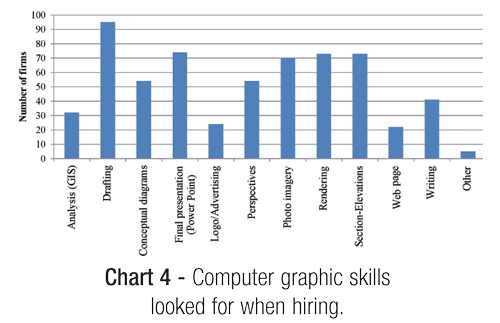 What type of computer graphic skills does your firm look for when hiring? (see chart 4.) Although there are only a few specific applications tied to the skills here, you will see a more complete list of applications in the next section. The biggest skill here is obviously drafting, with a mix of other communication skills such as Power Point presentations, which I would assume involve some speaking skills, renderings, section elevations and photo imagery. About half of the firms are also looking for perspective development, and conceptual diagrams. The ?EUR??,,????'?????<????????other?EUR??,,????'?????<????????????EUR??,,?? category included comments like they use computer graphics for construction documents or they are not hiring.