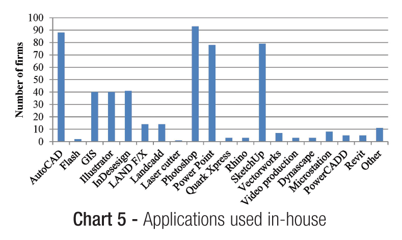 Which computer applications/technologies does your office use in-house? (see chart 5.) Over years of running this type of survey, I have gradually watched Photoshop climb in usage by firms and even surpass the use of AutoCAD. The top used applications in order of in-house use are: Photoshop, AutoCAD, SketchUp and Power Point. The other Adobe Creative Suite applications, such as Illustrator and InDesign, are moderately used, as is GIS.