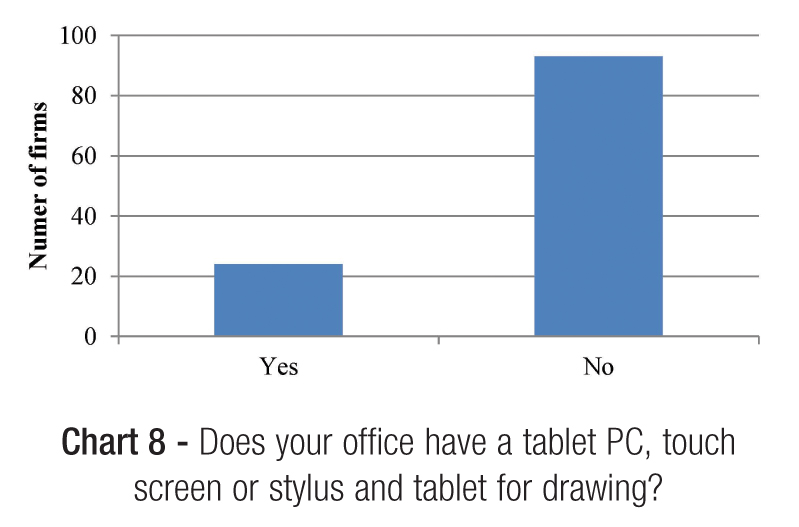 Does your office have a tablet PC, touch screen or tablet and stylus for drawing? (see chart 8.) The heavy use of PCs is still probably a lingering effect from AutoCAD. Although there is now a MAC version of AutoCAD, it is still a bit short of a full functioning PC version. The touch screen device has also been increasing over the years, especially now with the high use of simple devices like the iPhone and iPad. It seems to have opened up the idea of screen drawing in a way to bridge the technique of hand drawing on a digital surface, especially for Photoshop color rendering.