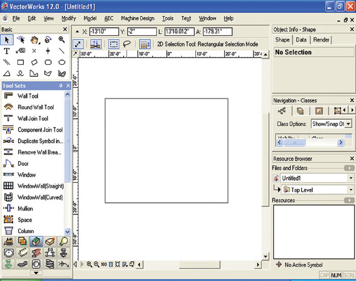When you open a new drawing you get what appears to be a full screen with a great amount of information. The drawing screen is located in the center of the screen and is surrounded by a ruler showing a real time measurement. Unlike AutoCAD which requires you to set drawing limits, with VectorWorks you can simply use your scroll button on the mouse and set your drawing space to any needed. This is a quick and easy improvement beyond AutoCAD.
