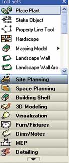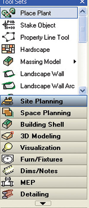 Beneath the drawing commands is an area called Tool Sets. This has specific tools for each of the different types of VectorWorks products. The products available are Architect, Designer, Landmark, Machine Design and Spotlight. Each of the programs contains the same basic CAD functionality of the VectorWorks program, but has different details available to that specific package. In another article I will focus on the Landmark package, which is most beneficial for the landscape industry. The Designer product contains all of the different packages as motioned. The products mentioned are specifically for use by Landscape Architects, architects, lighting designers and mechanical engineers.