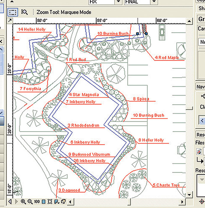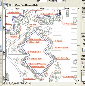 Since AutoCAD is the most widely used CAD program, it was important to see how easily an AutoCAD drawing could be imported in VectorWorks. Using a fairly complex planting design as an example, I was able to open an AutoCAD drawing with a few clicks of the mouse. Looking at the comparison between the two, you could not tell which was the original or which was the converted file. I also wanted to look at how the program translated into 3D. By using another DWG file and a few quick clicks I was able to successfully open the AutoCAD drawing in VectorWorks with no loss of information.
